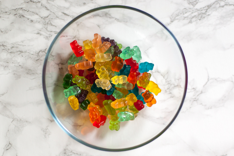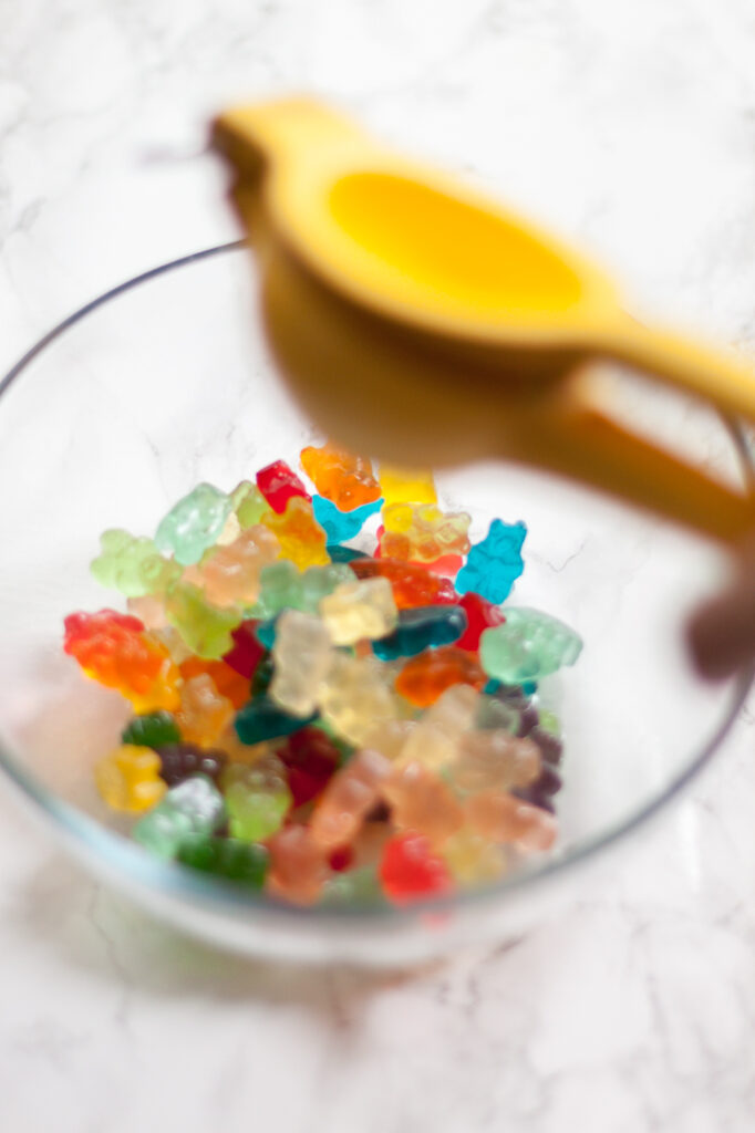 - Place gummy bears in a medium sized mixing bowl.