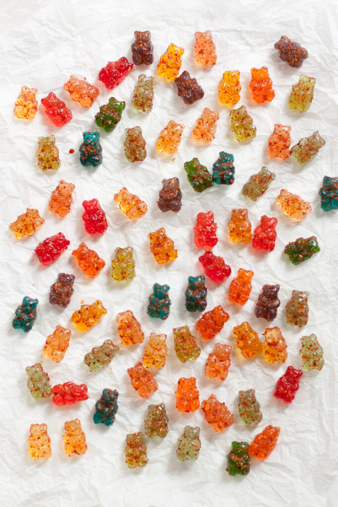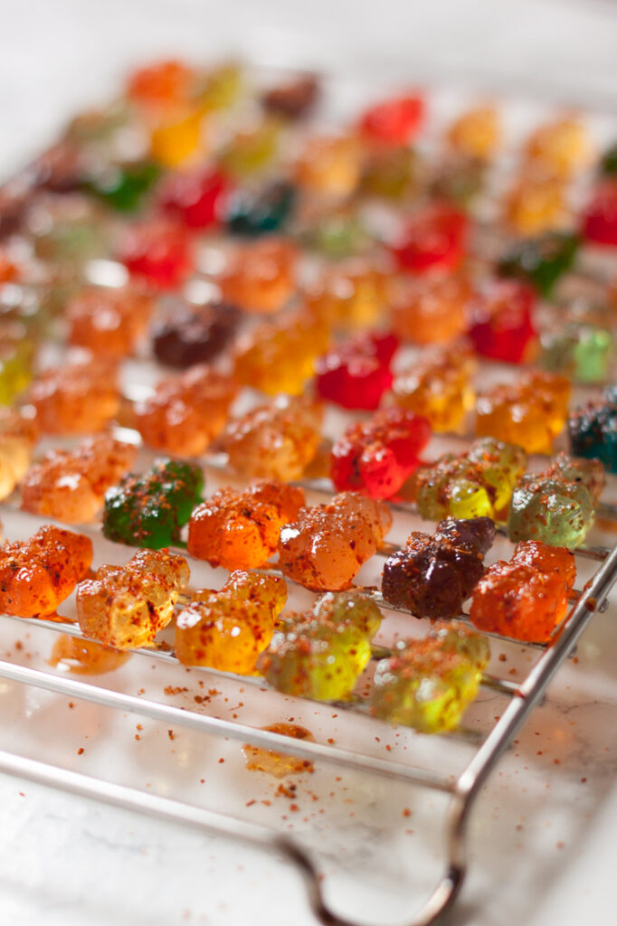 Place the coated gummy bears onto a wire cooling rack. Let them sit at room temperature to dry for around 1 to 2 hours. You’ll know the bears are dry when the Tajin crust hardens slightly on the outside and they no longer feel sticky. Once the gummy bears are fully dry, store them in an airtight container at room temperature. They should keep for up to two weeks, though I doubt they will last that long!