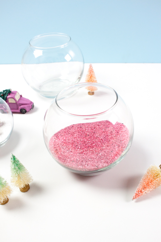 While you wait for the glue to dry, you can build your terrarium! This is the fun part. Fill your glass bowl with decorative sand.