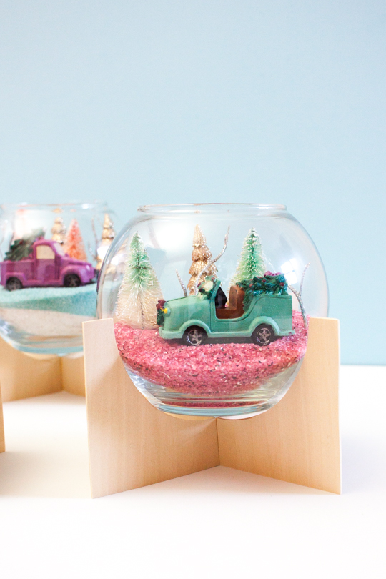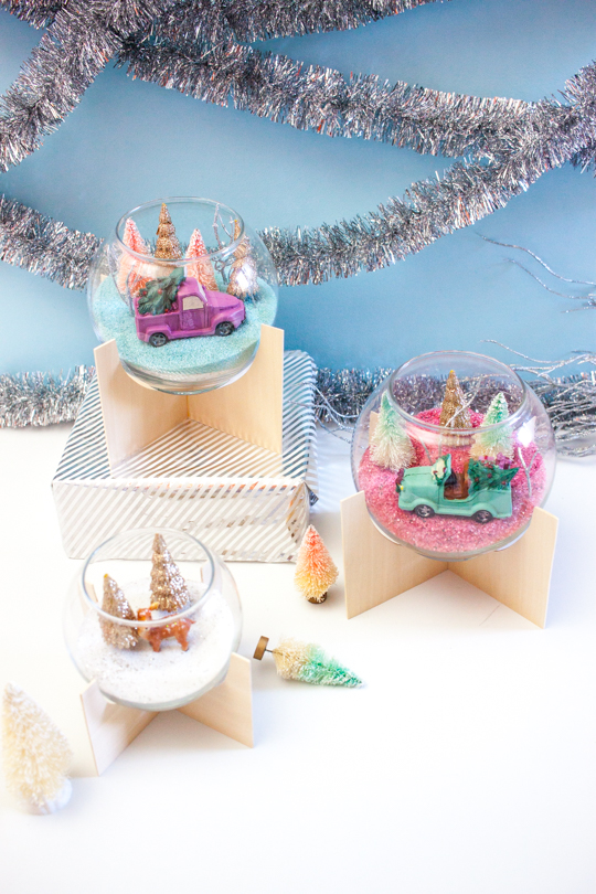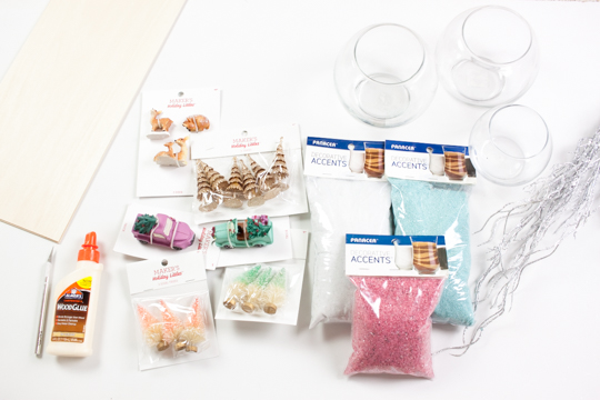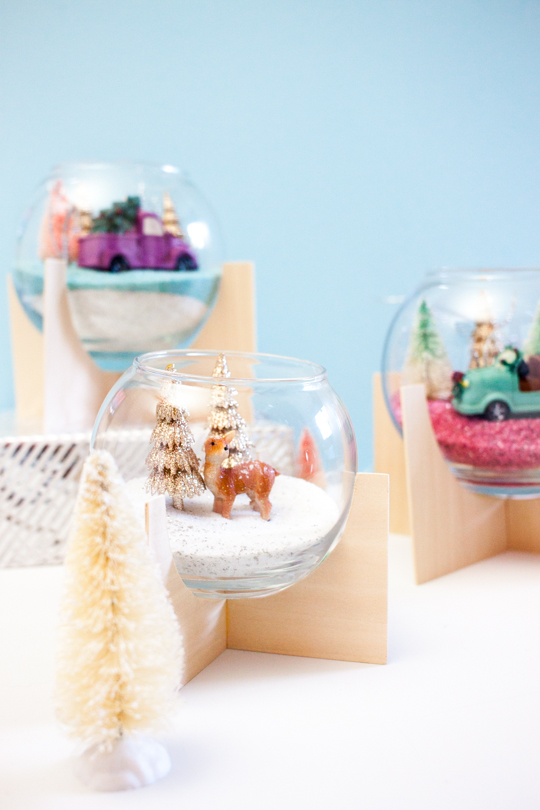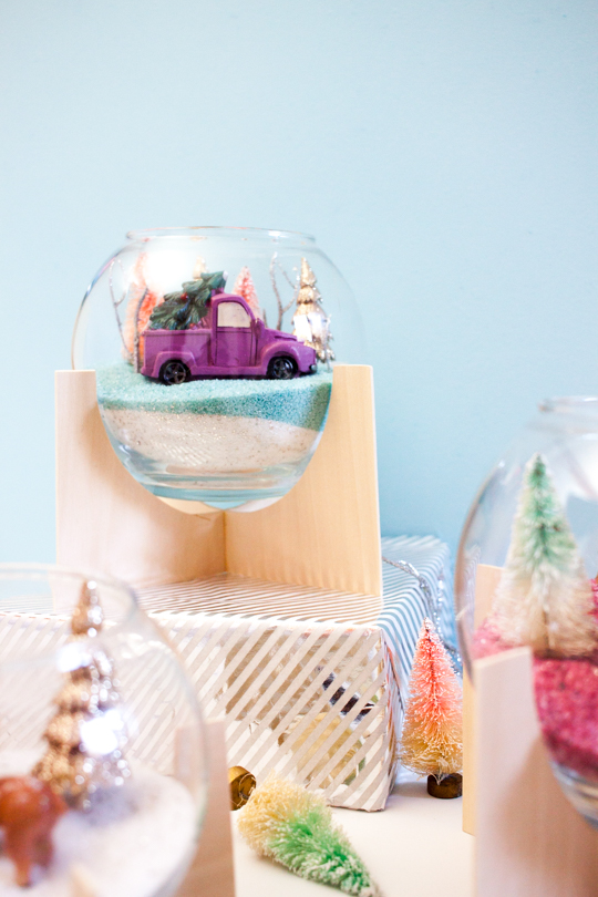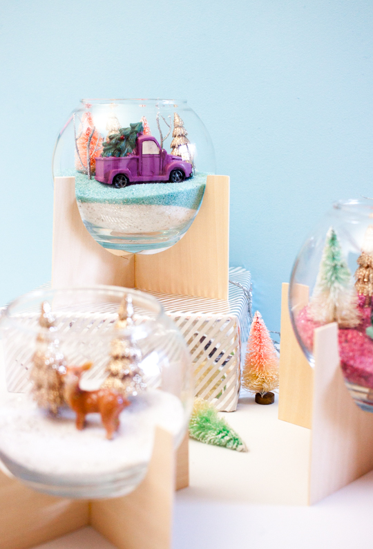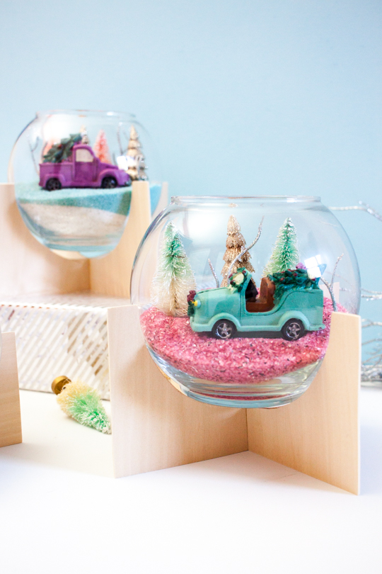 Once the glue is completely dry, and you’ve filled your holiday-themed terrariums, carefully place the bowl in the center of the wood pieces.